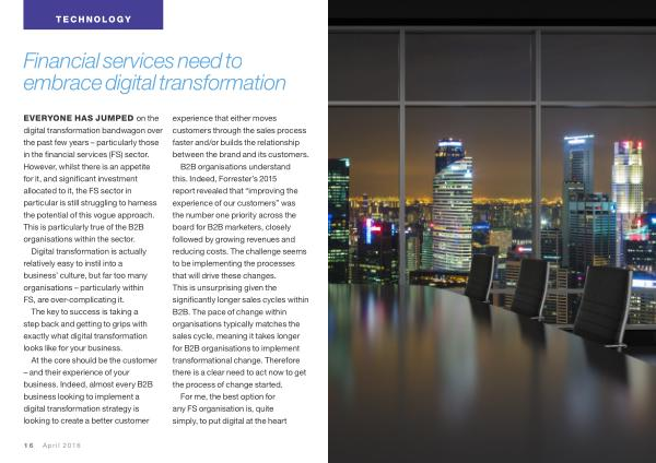 EVERYONE HAS JUMPED on the digital transformation bandwagon over the past few years – particularly those in the financial services ( FS ) sector . However , whilst there is an appetite for it , and significant investment allocated to it , the FS sector in particular is still struggling to harness the potential of this vogue approach . This is particularly true of the B2B organisations within the sector .