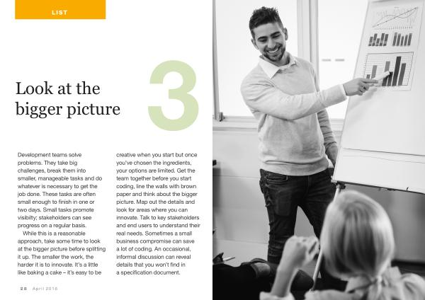 While this is a reasonable approach , take some time to look at the bigger picture before splitting it up . The smaller the work , the harder it is to innovate . It ’ s a little like baking a cake – it ’ s easy to be creative when you start but once you ’ ve chosen the ingredients , your options are limited . Get the team together before you start coding , line the walls with brown paper and think about the bigger picture . Map out the details and look for areas where you can innovate . Talk to key stakeholders and end users to understand their real needs . Sometimes a small business compromise can save a lot of coding . An occasional , informal discussion can reveal details that you won ’ t find in a specification document .