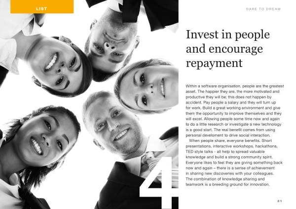 Within a software organisation , people are the greatest asset . The happier they are , the more motivated and productive they will be ; this does not happen by accident . Pay people a salary and they will turn up for work . Build a great working environment and give them the opportunity to improve themselves and they will excel . Allowing people some time now and again to do a little research or investigate a new technology is a good start . The real benefit comes from using personal develoment to drive social interaction .