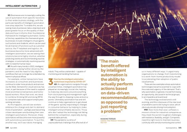 3How has the intelligent automation market been impacted by COVID-19 ? AD : As organisations navigate through uncertain times , intelligent automation has played an increasingly crucial role , helping to make key decisions around everything from stock planning and management right the way through to shipping routes and price points . Ultimately automation has and will continue to help organisations to get ahead of the game : quickly responding to changes in consumer behavior by helping to make intelligent and profitable decisions . Those who don ’ t adopt the technology risk falling behind the competition , especially during unpredictable periods .