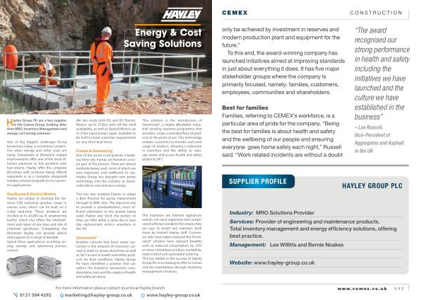 Hayley Group Plc are a key supplier to the Cemex Group , looking after their MRO , Inventory Management and energy cost saving solutions .