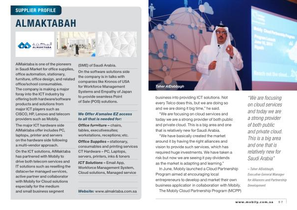 On the ICT solutions , AlMaktaba has partnered with Mobily to drive both telecom services and IT solutions such as reselling the datacenter managed services , active partner and collaborator with Mobily for Cloud solutions especially for the medium and small business segment