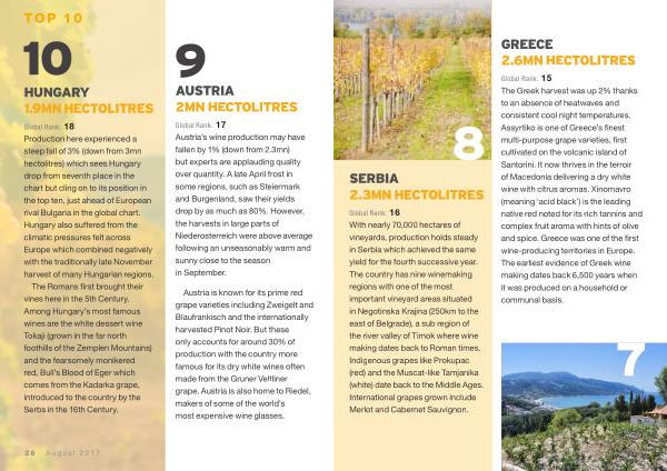 Global Rank : 18 Production here experienced a steep fall of 3 % ( down from 3mn hectolitres ) which sees Hungary drop from seventh place in the chart but cling on to its position in the top ten , just ahead of European rival Bulgaria in the global chart . Hungary also suffered from the climatic pressures felt across Europe which combined negatively with the traditionally late November harvest of many Hungarian regions .