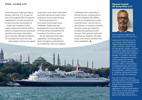across the group , helping to flag up issues in real time . It is , he says , all part of the ongoing effort to keep the organisation ’ s network and devices as secure as they can possibly be . Impett also oversees a hybrid system where some of Fred . Olsen ’ s systems , programmes and processes are held in the cloud , while others are on premise , although he believes it is inevitable that more and more organisations will have to migrate to the cloud , as the likes of Microsoft price their services at a point where customers have to make the jump .