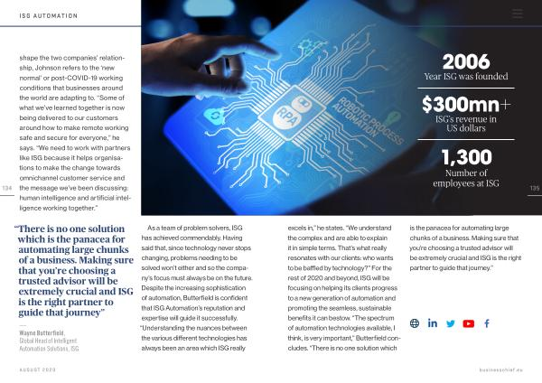 135 excels in ,” he states . “ We understand the complex and are able to explain it in simple terms . That ’ s what really resonates with our clients : who wants to be baffled by technology ?” For the rest of 2020 and beyond , ISG will be focusing on helping its clients progress to a new generation of automation and promoting the seamless , sustainable benefits it can bestow . “ The spectrum of automation technologies available , I think , is very important ,” Butterfield concludes . “ There is no one solution which is the panacea for automating large chunks of a business . Making sure that you ’ re choosing a trusted advisor will be extremely crucial and ISG is the right partner to guide that journey .”