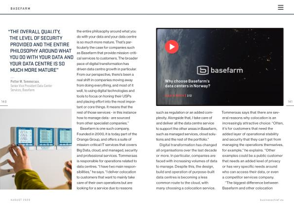 — Petter M . Tommeraas , Senior Vice President Data Center Services , Basefarm the entire philosophy around what you do with your data and your data centre is so much more mature . That ’ s particularly the case for companies such as Basefarm that provide mission-critical services to customers . The broader pace of digital transformation has driven data centre growth in particular . From our perspective , there ’ s been a real shift in companies moving away from doing everything , and most of it well , to using digital technologies and tools to focus on honing their USPs and placing effort into the most important or core things . It means that the rest of those services - in this instance how to manage data - are sourced from other specialist companies .”