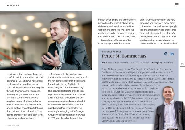 Petter M . Tømmeraas is Senior Vice President for Data Center Services in Basefarm . He has more than 20 years of experience within data centers , IT and telecommunications . After working for an American software and hardware vendor in the mid-90s , he started working in EUnet in the first half of 1998 and was part of the KPNQwest team that built a pan-European fibre network and a number of data centers all over Europe . In the years after , he worked within the companies that developed from the old EUnet and KPNQwest organisations mainly focusing on data center services , telecommunication services and managed services . In 2009 Tømmeraas helped set up a company to deliver data center services and managed services , mainly to the Norwegian market . The company was sold to Swedish publicly listed company Phonera . He then joined Norwegian data center company Green Mountain as the Chief Sales Officer of the company . In early 2018 Tømmeraas joined Basefarm as Senior Vice President Data Center Services . businesschief . eu