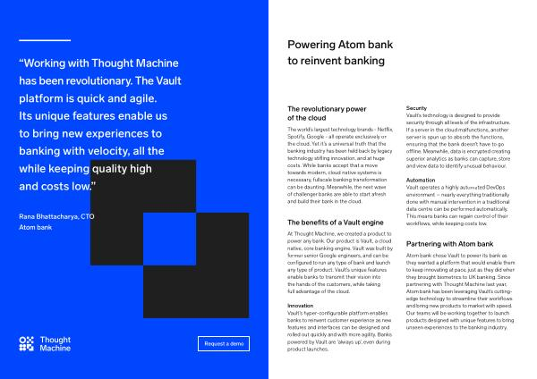 Atom bank chose Vault to power its bank as they wanted a platform that would enable them to keep innovating at pace , just as they did when they brought biometrics to UK banking . Since partnering with Thought Machine last year , Atom bank has been leveraging Vault ’ s cuttingedge technology to streamline their workflows and bring new products to market with speed . Our teams will be working together to launch products designed with unique features to bring unseen experiences to the banking industry .