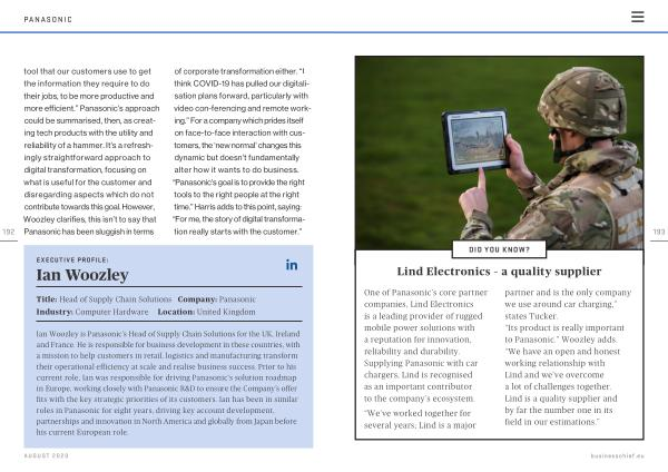 192 tool that our customers use to get the information they require to do their jobs , to be more productive and more efficient .” Panasonic ’ s approach could be summarised , then , as creating tech products with the utility and reliability of a hammer . It ’ s a refreshingly straightforward approach to digital transformation , focusing on what is useful for the customer and disregarding aspects which do not contribute towards this goal . However , Woozley clarifies , this isn ’ t to say that Panasonic has been sluggish in terms of corporate transformation either . “ I think COVID-19 has pulled our digitalisation plans forward , particularly with video con-ferencing and remote working .” For a company which prides itself on face-to-face interaction with customers , the ‘ new normal ’ changes this dynamic but doesn ’ t fundamentally alter how it wants to do business . “ Panasonic ’ s goal is to provide the right tools to the right people at the right time .” Harris adds to this point , saying : “ For me , the story of digital transformation really starts with the customer .”