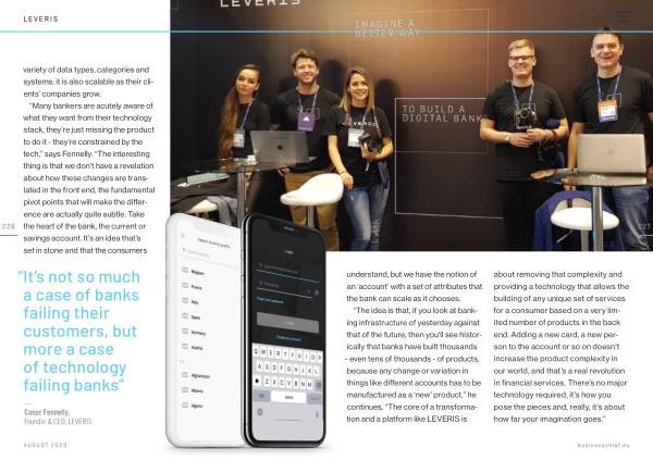 “ The idea is that , if you look at banking infrastructure of yesterday against that of the future , then you ’ ll see historically that banks have built thousands - even tens of thousands - of products , because any change or variation in things like different accounts has to be manufactured as a ‘ new ’ product ,” he continues . “ The core of a transformation and a platform like LEVERIS is about removing that complexity and providing a technology that allows the building of any unique set of services for a consumer based on a very limited number of products in the back end . Adding a new card , a new person to the account or so on doesn ’ t increase the product complexity in our world , and that ’ s a real revolution in financial services . There ’ s no major technology required , it ’ s how you pose the pieces and , really , it ’ s about how far your imagination goes .”