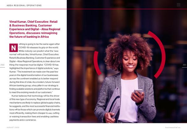 N othing is going to be the same again after COVID-19 releases its grip on the world . While nobody can predict what the ‘ new normal ’ will look like , Vimal Kumar , Chief Executive : Retail & Business Banking , Customer Experience and Digital – Absa Regional Operations , is clear about one thing : the response must be digital . “ COVID-19 has highlighted the importance of digital solutions ,” says Kumar . “ The investment we made over the past few years in the digital transformation of our businesses across the continent enabled us to better respond during this time of crisis . As a modern , future-forward African banking group , a key pillar in our strategy is finding scalable solutions and platforms that continue to meet the evolving needs of our customers .”