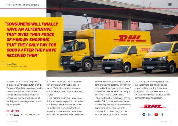In June 2020 , DHL announced one of its most recent partnerships in the fintech industry , with Dubai-based fintech Tabby to provide customers with an alternative to cash on delivery ( COD ).