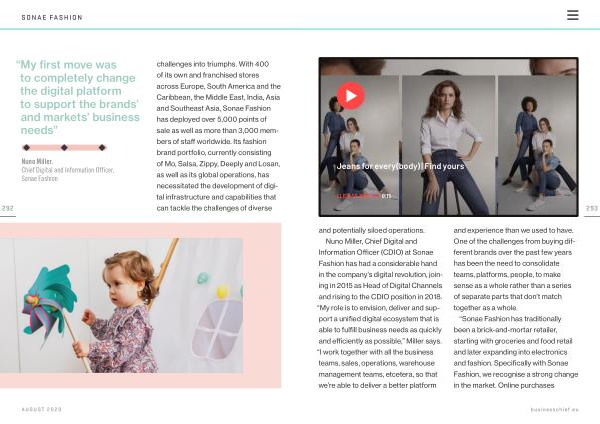 Nuno Miller , Chief Digital and Information Officer , Sonae Fashion challenges into triumphs . With 400 of its own and franchised stores across Europe , South America and the Caribbean , the Middle East , India , Asia and Southeast Asia , Sonae Fashion has deployed over 5,000 points of sale as well as more than 3,000 members of staff worldwide . Its fashion brand portfolio , currently consisting of Mo , Salsa , Zippy , Deeply and Losan , as well as its global operations , has necessitated the development of digital infrastructure and capabilities that can tackle the challenges of diverse