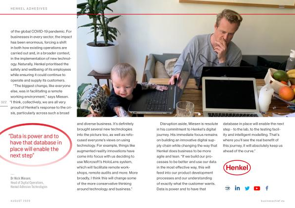 Disruption aside , Miesen is resolute in his commitment to Henkel ’ s digital journey . His immediate focus remains on building an innovative digital supply chain while changing the way that Henkel does business to be more agile and lean . “ If we build our processes to be better and use our data in the most effective way , this will feed into our product development processes and our understanding of exactly what the customer wants . Data is power and to have that database in place will enable the next step - to the lab , to the testing facility and intelligent modelling . That ’ s where you ’ ll see the real benefit of this journey , it will absolutely keep us ahead of the curve .” businesschief . eu