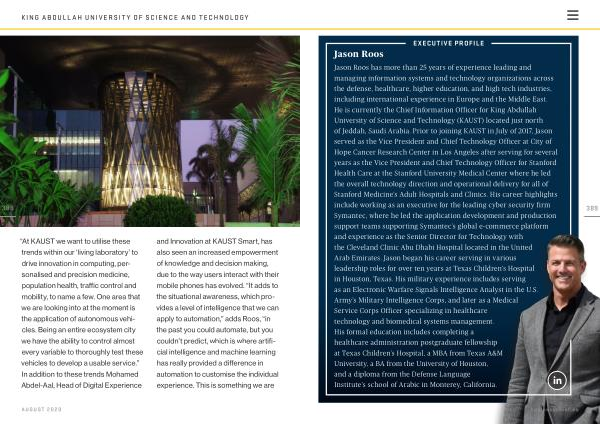 Jason Roos has more than 25 years of experience leading and managing information systems and technology organizations across the defense , healthcare , higher education , and high tech industries , including international experience in Europe and the Middle East . He is currently the Chief Information Officer for King Abdullah University of Science and Technology ( KAUST ) located just north of Jeddah , Saudi Arabia . Prior to joining KAUST in July of 2017 , Jason served as the Vice President and Chief Technology Officer at City of Hope Cancer Research Center in Los Angeles after serving for several years as the Vice President and Chief Technology Officer for Stanford Health Care at the Stanford University Medical Center where he led the overall technology direction and operational delivery for all of Stanford Medicine ’ s Adult Hospitals and Clinics . His career highlights include working as an executive for the leading cyber security firm Symantec , where he led the application development and production support teams supporting Symantec ’ s global e-commerce platform and experience as the Senior Director for Technology with the Cleveland Clinic Abu Dhabi Hospital located in the United Arab Emirates . Jason began his career serving in various leadership roles for over ten years at Texas Children ’ s Hospital in Houston , Texas . His military experience includes serving as an Electronic Warfare Signals Intelligence Analyst in the U . S . Army ’ s Military Intelligence Corps , and later as a Medical Service Corps Officer specializing in healthcare technology and biomedical systems management . His formal education includes completing a healthcare administration postgraduate fellowship at Texas Children ’ s Hospital , a MBA from Texas A & M University , a BA from the University of Houston , and a diploma from the Defense Language Institute ’ s school of Arabic in Monterey , California .