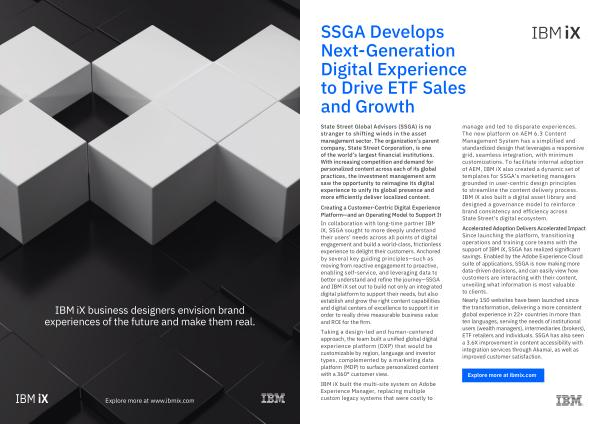 State Street Global Advisors ( SSGA ) is no stranger to shifting winds in the asset management sector . The organization ’ s parent company , State Street Corporation , is one of the world ’ s largest financial institutions . With increasing competition and demand for personalized content across each of its global practices , the investment management arm saw the opportunity to reimagine its digital experience to unify its global presence and more efficiently deliver localized content . Creating a Customer-Centric Digital Experience Platform — and an Operating Model to Support It In collaboration with long-time partner IBM iX , SSGA sought to more deeply understand their users ’ needs across all points of digital engagement and build a world-class , frictionless experience to delight their customers . Anchored by several key guiding principles — such as moving from reactive engagement to proactive , enabling self-service , and leveraging data to better understand and refine the journey — SSGA and IBM iX set out to build not only an integrated digital platform to support their needs , but also establish and grow the right content capabilities and digital centers of excellence to support it in order to really drive measurable business value and ROI for the firm .