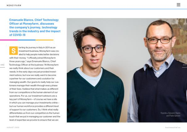 S tarting its journey in Italy in 2011 as an investment business , Moneyfarm was created to help people make better decisions with their money . “ I officially joined Moneyfarm three years ago ,” says Emanuele Blanco , Chief Technology Officer at the business “ At Moneyfarm we really think about our customers and their needs . In the early days we just provided investment advice , but now we really want to become a partner for our customers and a solution for managing wealth . Our goal is to really help our customers manage their wealth through every phase of their lives . I believe that what makes us different from our competitors is the human element of our operations . For us , our investment advisors are a key part of Moneyfarm – of course we have a site in which you can manage your investments online – but our human workforce provides a different level of support to our customers . So , I think what really differentiates us from our competitors is the human touch that we put in managing our customer and the level of expertise we provide to ensure that we are
