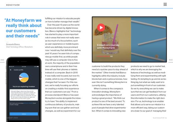 When it comes to the company ’ s innovation strategy , Moneyfarm acknowledges the importance of having a great product . “ We think our product is one of the best around . To achieve this we have a very talented pool of people that drive experimentation . When it comes to innovating new products we need to go to market fast , which is why we are leveraging the features of technology as well as modifying them and experimenting with split testing . It ’ s tempting to go and do something big , but what we really want is to put something in front of our customer . So we try everything we can to make sure that we can get feedback from our users and from our customers , utilising this information to make the right decision . For us , technology is an enabler that allows us to serve our mission in a more efficient way , taking our customers closer to our goal of managing their