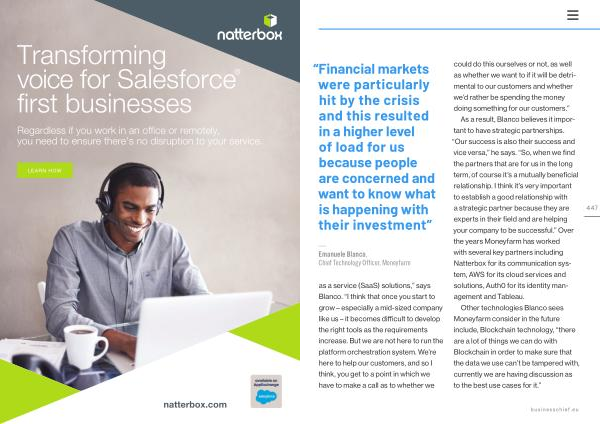 As a result , Blanco believes it important to have strategic partnerships . “ Our success is also their success and vice versa ,” he says . “ So , when we find the partners that are for us in the long term , of course it ’ s a mutually beneficial relationship . I think it ’ s very important to establish a good relationship with a strategic partner because they are experts in their field and are helping your company to be successful .” Over the years Moneyfarm has worked with several key partners including Natterbox for its communication system , AWS for its cloud services and solutions , Auth0 for its identity management and Tableau .