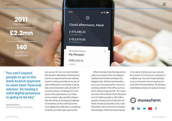 — Emanuele Blanco , Chief Technology Officer , Moneyfarm very proud of how we have handled this situation effectively . At Moneyfarm a lot of our departments were already used to working remotely as we are all quite distributed so switching to being fully remote has been quite smooth . Of course it ’ s been a challenge for some parts of the organisation , but I think we ’ ve worked really well . But I believe that this will be an emerging challenge for industries as the world becomes more digital and while this is a challenge it will also provide huge opportunity .”