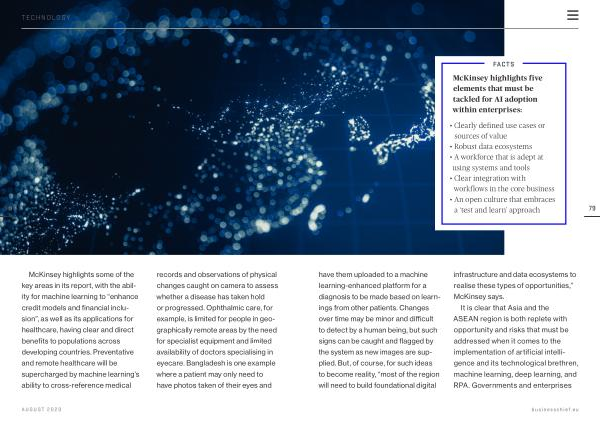 • An open culture that embraces ‘ test and learn ’ approach a ‘ test and learn ’ approach 79 have them uploaded to a machine learning-enhanced platform for a diagnosis to be made based on learnings from other patients . Changes over time may be minor and difficult to detect by a human being , but such signs can be caught and flagged by the system as new images are supplied . But , of course , for such ideas to become reality , “ most of the region will need to build foundational digital infrastructure and data ecosystems to realise these types of opportunities ,” McKinsey says .