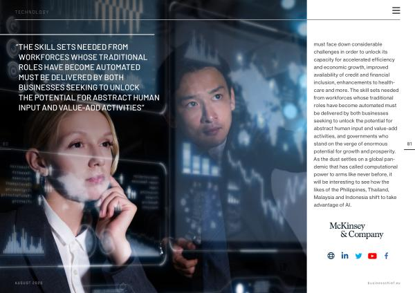 must face down considerable challenges in order to unlock its capacity for accelerated efficiency and economic growth , improved availability of credit and financial inclusion , enhancements to healthcare and more . The skill sets needed from workforces whose traditional roles have become automated must be delivered by both businesses seeking to unlock the potential for abstract human input and value-add activities , and governments who stand on the verge of enormous potential for growth and prosperity . As the dust settles on a global pandemic that has called computational power to arms like never before , it will be interesting to see how the likes of the Philippines , Thailand , Malaysia and Indonesia shift to take advantage of AI .