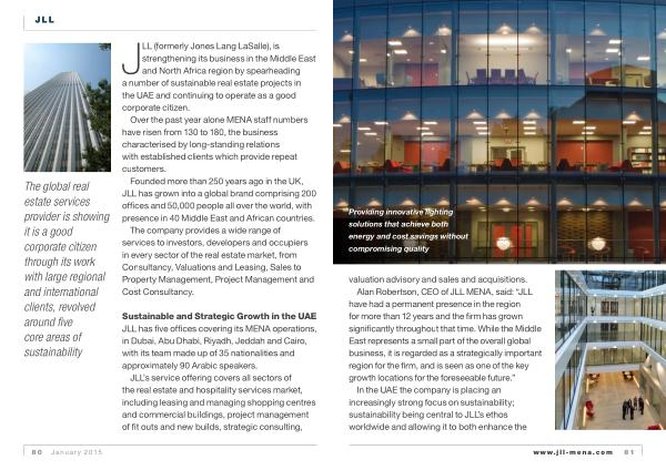 Alan Robertson , CEO of JLL MENA , said : “ JLL have had a permanent presence in the region for more than 12 years and the firm has grown significantly throughout that time . While the Middle East represents a small part of the overall global business , it is regarded as a strategically important region for the firm , and is seen as one of the key growth locations for the foreseeable future .” In the UAE the company is placing an increasingly strong focus on sustainability ; sustainability being central to JLL ’ s ethos worldwide and allowing it to both enhance the www . jll-mena . com 81