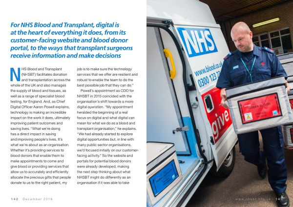 NHS Blood and Transplant ( NHSBT ) facilitates donation and transplantation across the whole of the UK and also manages the supply of blood and tissues , as well as a range of specialist blood testing , for England . And , as Chief Digital Officer Aaron Powell explains , technology is making an incredible impact on the work it does , ultimately improving patient outcomes and saving lives . “ What we ’ re doing has a direct impact in saving and improving people ’ s lives . It ’ s what we ’ re about as an organisation . Whether it ’ s providing services to blood donors that enable them to make appointments to come and give blood or providing services that allow us to accurately and efficiently allocate the precious gifts that people donate to us to the right patient , my job is to make sure the technology services that we offer are resilient and robust to enable the team to do the best possible job that they can do .”