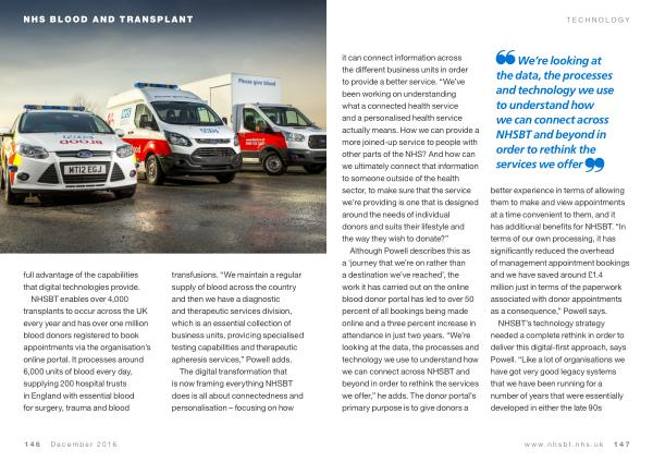 full advantage of the capabilities that digital technologies provide . NHSBT enables over 4,000 transplants to occur across the UK every year and has over one million blood donors registered to book appointments via the organisation ’ s online portal . It processes around 6,000 units of blood every day , supplying 200 hospital trusts in England with essential blood for surgery , trauma and blood transfusions . “ We maintain a regular supply of blood across the country and then we have a diagnostic and therapeutic services division , which is an essential collection of business units , providing specialised testing capabilities and therapeutic apheresis services ,” Powell adds .