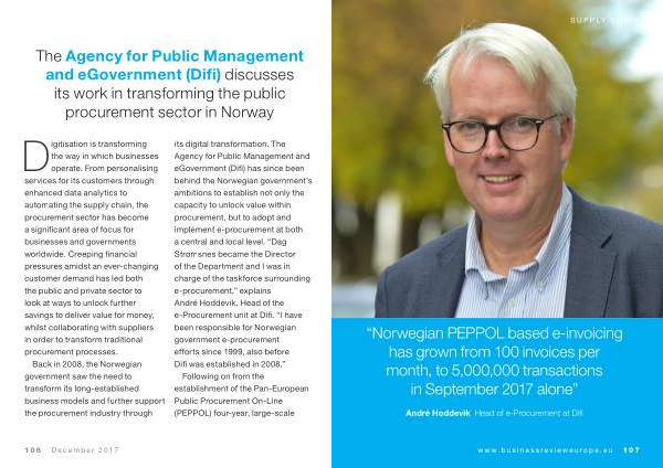 Back in 2008 , the Norwegian government saw the need to transform its long-established business models and further support the procurement industry through its digital transformation . The Agency for Public Management and eGovernment ( Difi ) has since been behind the Norwegian government ’ s ambitions to establish not only the capacity to unlock value within procurement , but to adopt and implement e-procurement at both a central and local level . “ Dag Strømsnes became the Director of the Department and I was in charge of the taskforce surrounding e-procurement ,” explains André Hoddevik , Head of the e-Procurement unit at Difi . “ I have been responsible for Norwegian government e-procurement efforts since 1999 , also before Difi was established in 2008 .”