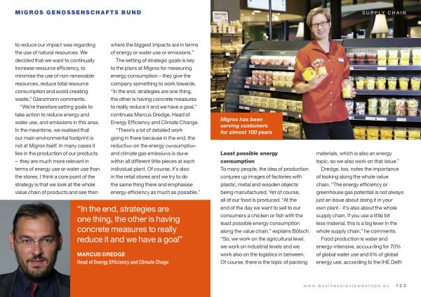 Least possible energy consumption To many people , the idea of production conjures up images of factories with plastic , metal and wooden objects being manufactured . Yet of course , all of our food is produced . “ At the end of the day we want to sell to our consumers a chicken or fish with the least possible energy consumption along the value chain ,” explains Bötsch . “ So , we work on the agricultural level , we work on industrial levels and we work also on the logistics in between . Of course , there is the topic of packing materials , which is also an energy topic , so we also work on that issue .”