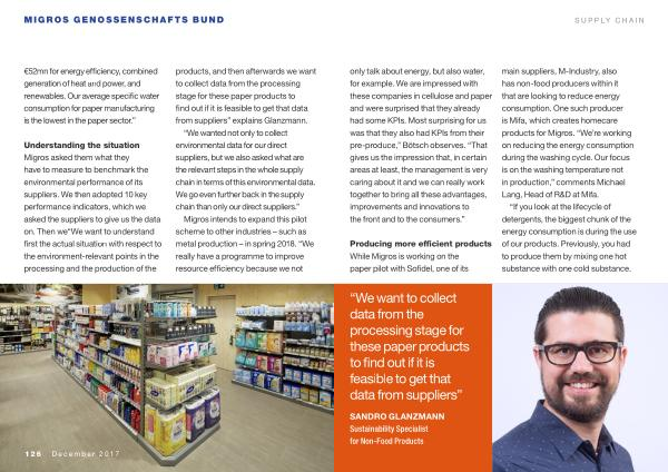 Understanding the situation Migros asked them what they have to measure to benchmark the environmental performance of its suppliers . We then adopted 10 key performance indicators , which we asked the suppliers to give us the data on . Then we “ We want to understand first the actual situation with respect to the environment-relevant points in the processing and the production of the products , and then afterwards we want to collect data from the processing stage for these paper products to find out if it is feasible to get that data from suppliers ” explains Glanzmann .