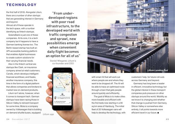Lilium isn ’ t alone , however , when it comes to transport tech . German startups have been racing those in Silicon Valley to reinvent transport for some time . Moia is a company owned by Volkswagen that is building on-demand shuttle buses , equipped