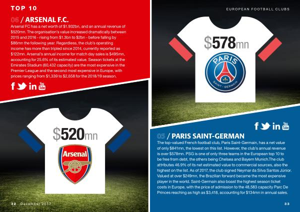 The top-valued French football club , Paris Saint-Germain , has a net value of only $ 841mn , the lowest on this list . However , the club ’ s annual revenue is over $ 578mn . PSG is one of only three teams in the European top 10 to be free from debt , the others being Chelsea and Bayern Munich . The club attributes 46.9 % of its net estimated value to commercial sources , also the highest on the list . As of 2017 , the club signed Neymar da Silva Santos Júnior . Valued at over $ 249mn , the Brazilian forward became the most expensive player in the world . Saint-Germain also boast the highest season ticket costs in Europe , with the price of admission to the 48,583 capacity Parc De Princes reaching as high as $ 3,418 , accounting for $ 134mn in annual sales .