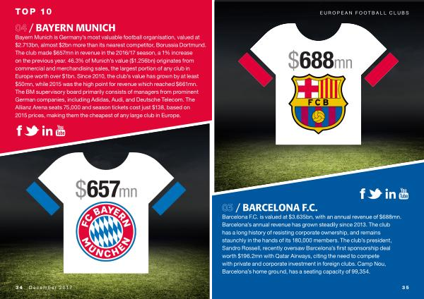 Barcelona F . C . is valued at $ 3.635bn , with an annual revenue of $ 688mn . Barcelona ’ s annual revenue has grown steadily since 2013 . The club has a long history of resisting corporate ownership , and remains staunchly in the hands of its 180,000 members . The club ’ s president , Sandro Rossell , recently oversaw Barcelona ’ s first sponsorship deal worth $ 196.2mn with Qatar Airways , citing the need to compete with private and corporate investment in foreign clubs . Camp Nou , Barcelona ’ s home ground , has a seating capacity of 99,354 .