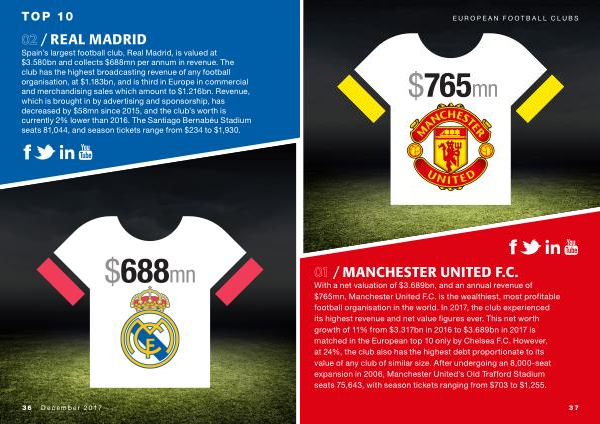 Spain ’ s largest football club , Real Madrid , is valued at $ 3.580bn and collects $ 688mn per annum in revenue . The club has the highest broadcasting revenue of any football organisation , at $ 1.183bn , and is third in Europe in commercial and merchandising sales which amount to $ 1.216bn . Revenue , which is brought in by advertising and sponsorship , has decreased by $ 58mn since 2015 , and the club ’ s worth is currently 2 % lower than 2016 . The Santiago Bernabéu Stadium seats 81,044 , and season tickets range from $ 234 to $ 1,930 . $ 688mn