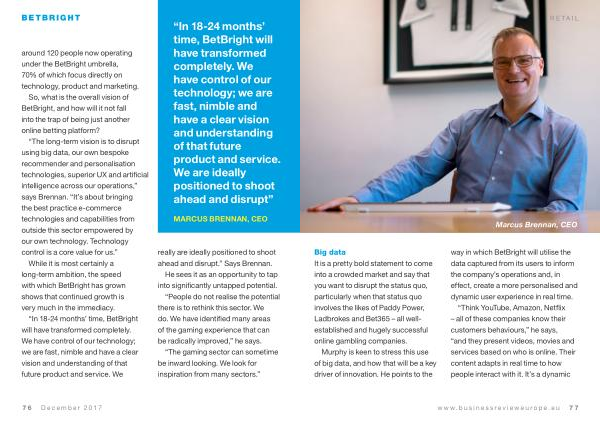 “ In 18-24 months ’ time , BetBright will have transformed completely . We have control of our technology ; we are fast , nimble and have a clear vision and understanding of that future product and service . We are ideally positioned to shoot ahead and disrupt ”