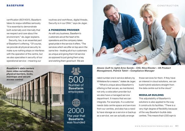 Security , too , is an essential part of Basefarm ’ s offering . “ Of course , we provide all physical security to make sure nothing stops or interferes with the operation of the centre , but we also specialise in security of our operational service – meaning our routines and workflows , digital threats . Security is in our DNA ,” says de Jager .