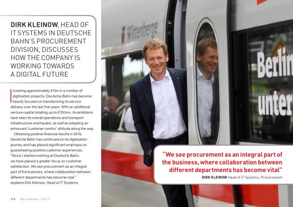 Investing approximately € 1bn in a number of digitisation projects , Deutsche Bahn has become heavily focused on transforming its service delivery over the last five years . With an additional venture capital totalling up to € 100mn , its ambitions have seen its overall operations and transport infrastructure overhauled , as well as adopting an enhanced ‘ customer-centric ’ attitude along the way . Obtaining positive financial results in 2016 , Deutsche Bahn has continued on its digitisation journey and has placed significant emphasis on guaranteeing positive customer experiences . “ Since I started working at Deutsche Bahn , we have placed a greater focus on customer satisfaction . We see procurement as an integral part of the business , where collaboration between different departments has become vital ,” explains Dirk Kleinow , Head of IT Systems .