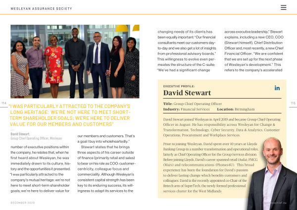 changing needs of its clients has been equally important : “ Our financial consultants meet our customers dayto-day and we also get a lot of insights from professional advisory boards .” This willingness to evolve even permeates the structure of the C-suite : “ We ’ ve had a significant change across executive leadership ,” Stewart explains , including a new CEO , COO ( Stewart himself ), Chief Distribution Officer and , most recently , a new Chief Financial Officer . “ We are confident that we are set up for the next phase of Wesleyan ’ s development .” This refers to the company ’ s accelerated