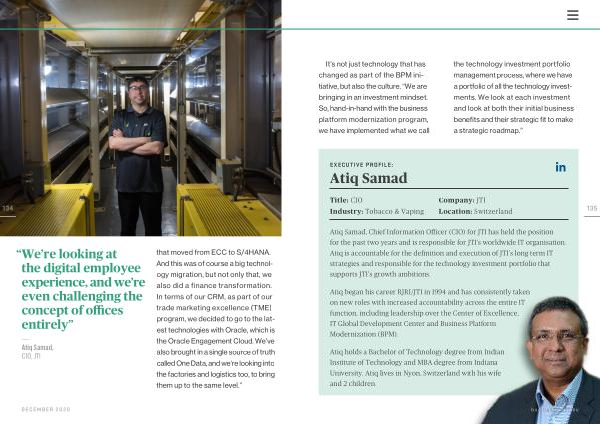 — Atiq Samad , CIO , JTI that moved from ECC to S / 4HANA . And this was of course a big technology migration , but not only that , we also did a finance transformation . In terms of our CRM , as part of our trade marketing excellence ( TME ) program , we decided to go to the latest technologies with Oracle , which is the Oracle Engagement Cloud . We ’ ve also brought in a single source of truth called One Data , and we ‘ re looking into the factories and logistics too , to bring them up to the same level .”