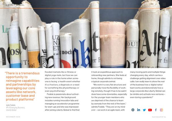“ We work in a very flat structure and personally l love the flexibility of working remotely , though it has to be said it does have some downsides , especially for the younger team members who are deprived of the chance to learn by osmosis from the rest of the team ,” admits Fedele . “ They are on my mind a lot – we work in an agile team , with many moving parts and multiple things changing every day , which can be a challenge getting alignment over video calls : I am really keen to show the rest of the business how a ‘ digital native ’ team works and demonstrate how a large corporate like Liberty Global can be nimble and activate new ventures – even during a pandemic !”