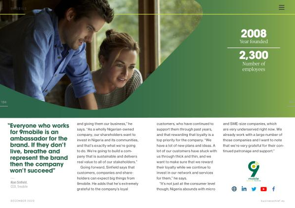— Alan Sinfield , CEO , 9mobile and giving them our business ,” he says . “ As a wholly Nigerian-owned company , our shareholders want to invest in Nigeria and its communities , and that ’ s exactly what we ’ re going to do . We ’ re going to build a company that is sustainable and delivers real value to all of our stakeholders .”
