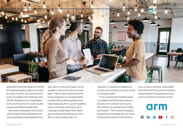 It ’ s no surprise then that Bornstein is confident that Arm ’ s procurement function will continue to live up to the company ’ s reputation as a hightech leader . “ The world is changing . Industries are changing . But our focus in Group Procurement will continue to be a value-creating , responsible and effective Procurement function , supporting Arm ’ s business and mission to architect a smarter world .”
