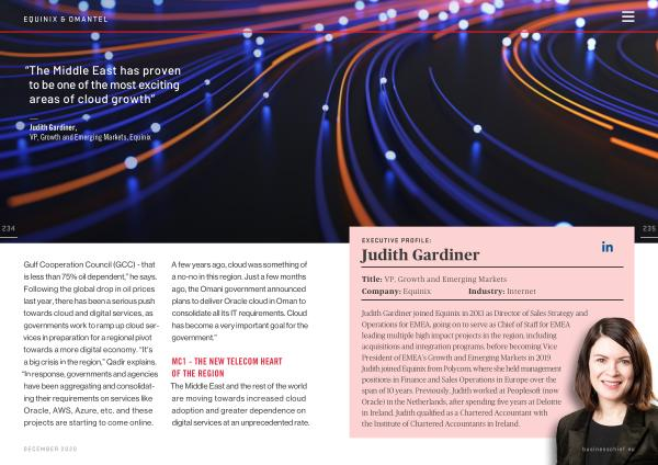 235 Judith Gardiner joined Equinix in 2013 as Director of Sales Strategy and Operations for EMEA , going on to serve as Chief of Staff for EMEA leading multiple high impact projects in the region , including acquisitions and integration programs , before becoming Vice President of EMEA ’ s Growth and Emerging Markets in 2019 . Judith joined Equinix from Polycom , where she held management positions in Finance and Sales Operations in Europe over the span of 10 years . Previously , Judith worked at Peoplesoft ( now Oracle ) in the Netherlands , after spending five years at Deloitte in Ireland . Judith qualified as a Chartered Accountant with the Institute of Chartered Accountants in Ireland . businesschief . eu