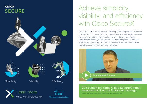 Cisco SecureX is a cloud-native , built-in platform experience within our portfolio and connected to your infrastructure . It is integrated and open for simplicity , unified in one location for visibility , and maximizes operational efficiency to secure your network , endpoints , cloud , and applications . It radically reduces the dwell time and human-powered tasks to counter attacks and stay compliant