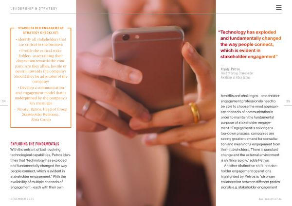 benefits and challenges - stakeholder engagement professionals need to be able to choose the most appropriate channels of communication in order to maintain the fundamental purpose of stakeholder engagement . “ Engagement is no longer a top-down process , companies are seeing greater demand for consultation and meaningful engagement from their stakeholders . There is constant change and the external environment is shifting rapidly ,” adds Petros .
