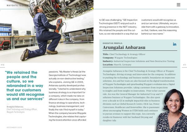 Arungalai Anbarasu is the Chief Technology & Strategy Officer at Waygate Technologies , driving strategy and innovation for the company . In addition to pushing the technology and business models , boundaries on inspection solutions , Aru and her team are also focused on the digital transformation of Waygate Technologies and spearheading Waygate ’ s evolution into a Digital Inspection Solutions provider , taking customers from inspections to insights and from insights to innovations . Prior to her current role , Aru was the General Manager for Industrial X-ray and CT solutions business at Waygate Technologies . She also spent over a decade in GE in multiple impactful roles in business divisions such as Global Research Centre , Oil & Gas , Power Conversion , Healthcare and Renewables . She is passionate about encouraging Women in STEM fields and continues to pursue avenues to support this topic . Aru currently resides in Hannover with her husband Divyang and daughter Ada .