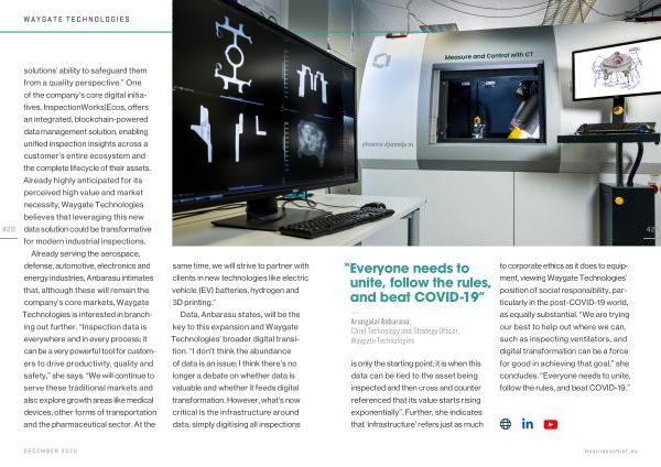 is only the starting point ; it is when this data can be tied to the asset being inspected and then cross and counter referenced that its value starts rising exponentially ”. Further , she indicates that ‘ infrastructure ’ refers just as much to corporate ethics as it does to equipment , viewing Waygate Technologies ’ position of social responsibility , particularly in the post-COVID-19 world , as equally substantial . “ We are trying our best to help out where we can , such as inspecting ventilators , and digital transformation can be a force for good in achieving that goal ,” she concludes . “ Everyone needs to unite , follow the rules , and beat COVID-19 .”