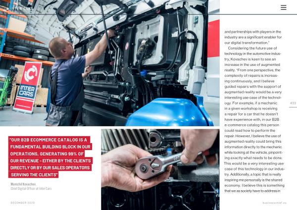 Considering the future use of technology in the automotive industry , Kovachev is keen to see an increase in the use of augmented reality . “ From one perspective , the complexity of repairs is increasing continuously , and I believe guided repairs with the support of augmented reality would be a very interesting use case of the technology . For example , if a mechanic in a given workshop is receiving a repair for a car that he doesn ’ t have experience with , in our B2B e-commerce catalog this person could read how to perform the repair . However , I believe the use of augmented reality could bring this information directly to the mechanic while looking at the vehicle , pinpointing exactly what needs to be done . This would be a very interesting use case of this technology in our industry . Additionally , a topic that is really inspiring me personally is the shared economy . I believe this is something that we as society have to address in